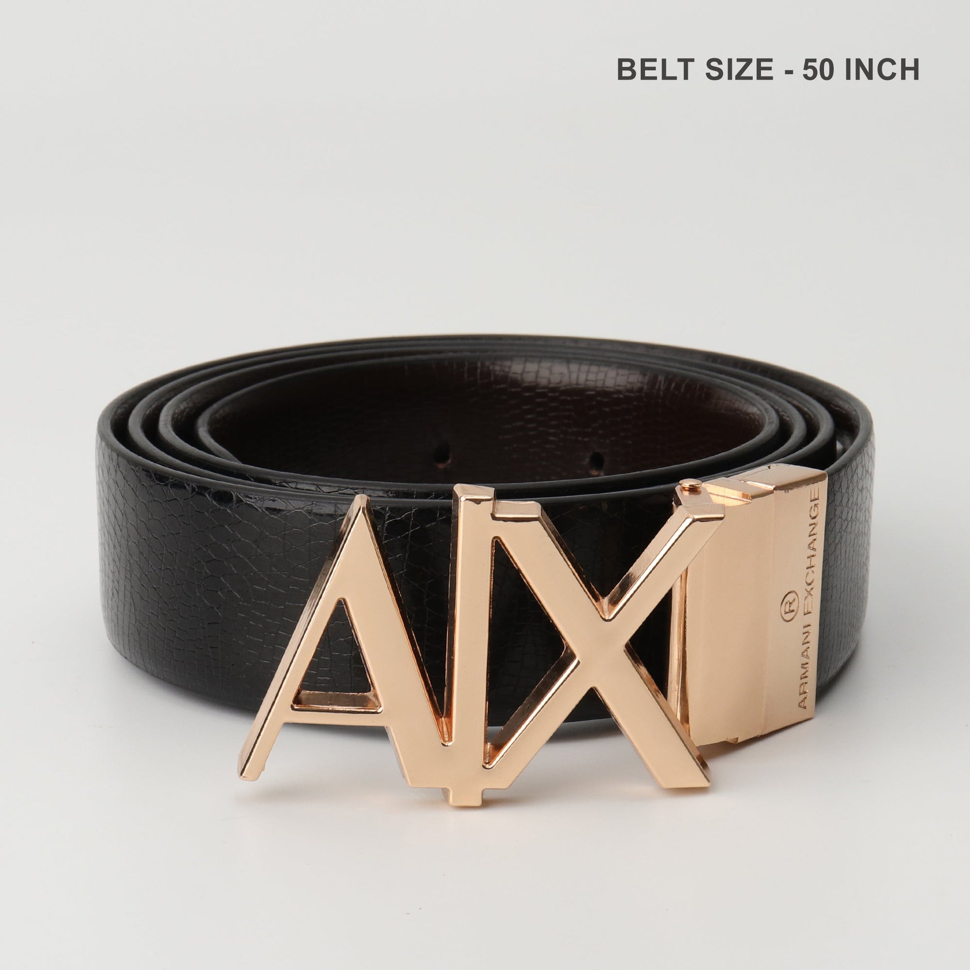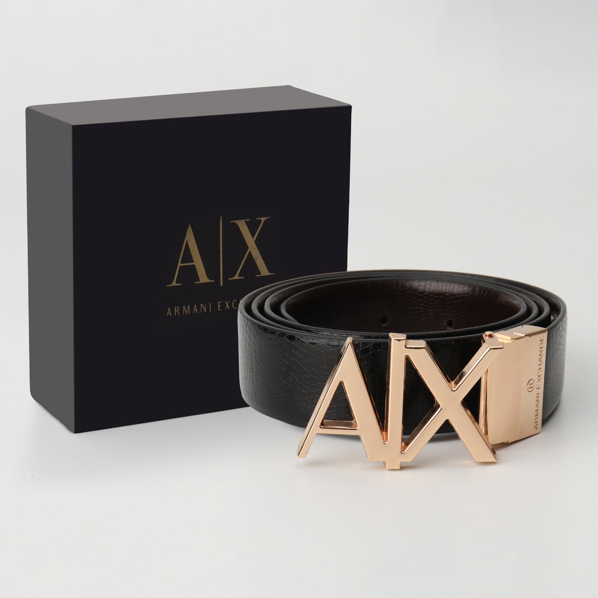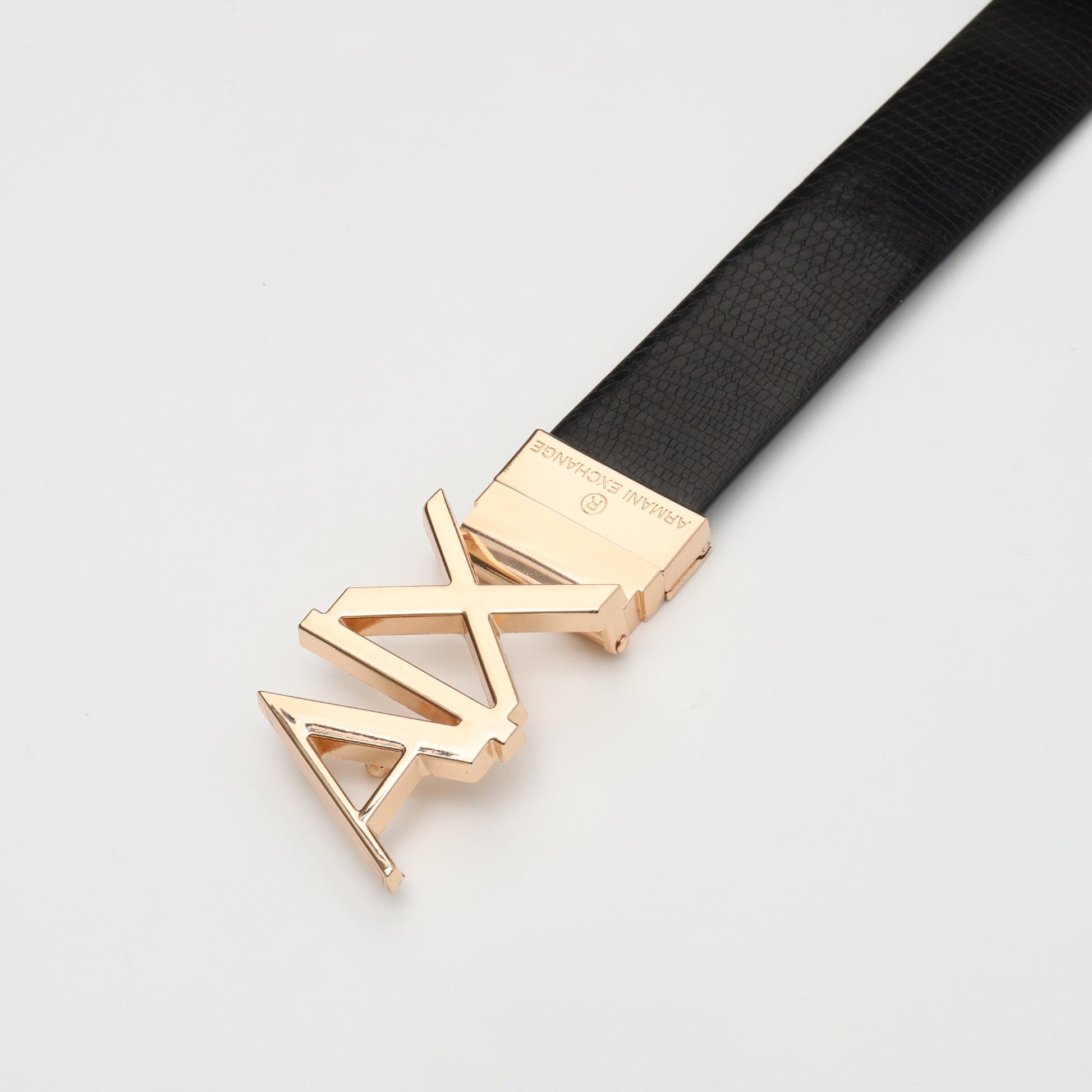 Bold and fashion-forward, this Armani Exchange belt brings high-street sophistication with a sleek black leather base and oversized A|X buckle in a statement rose gold finish. The epitome of urban luxury.