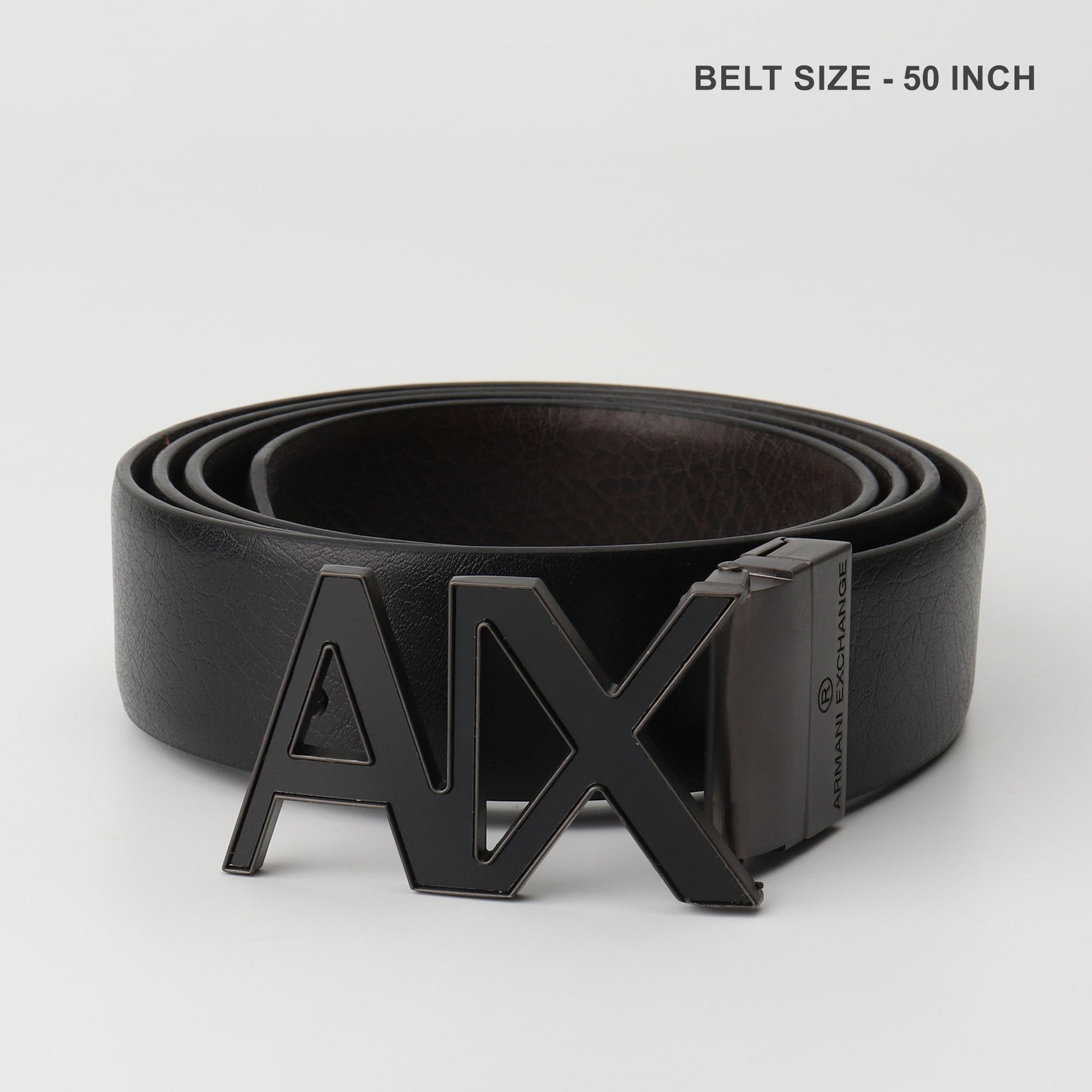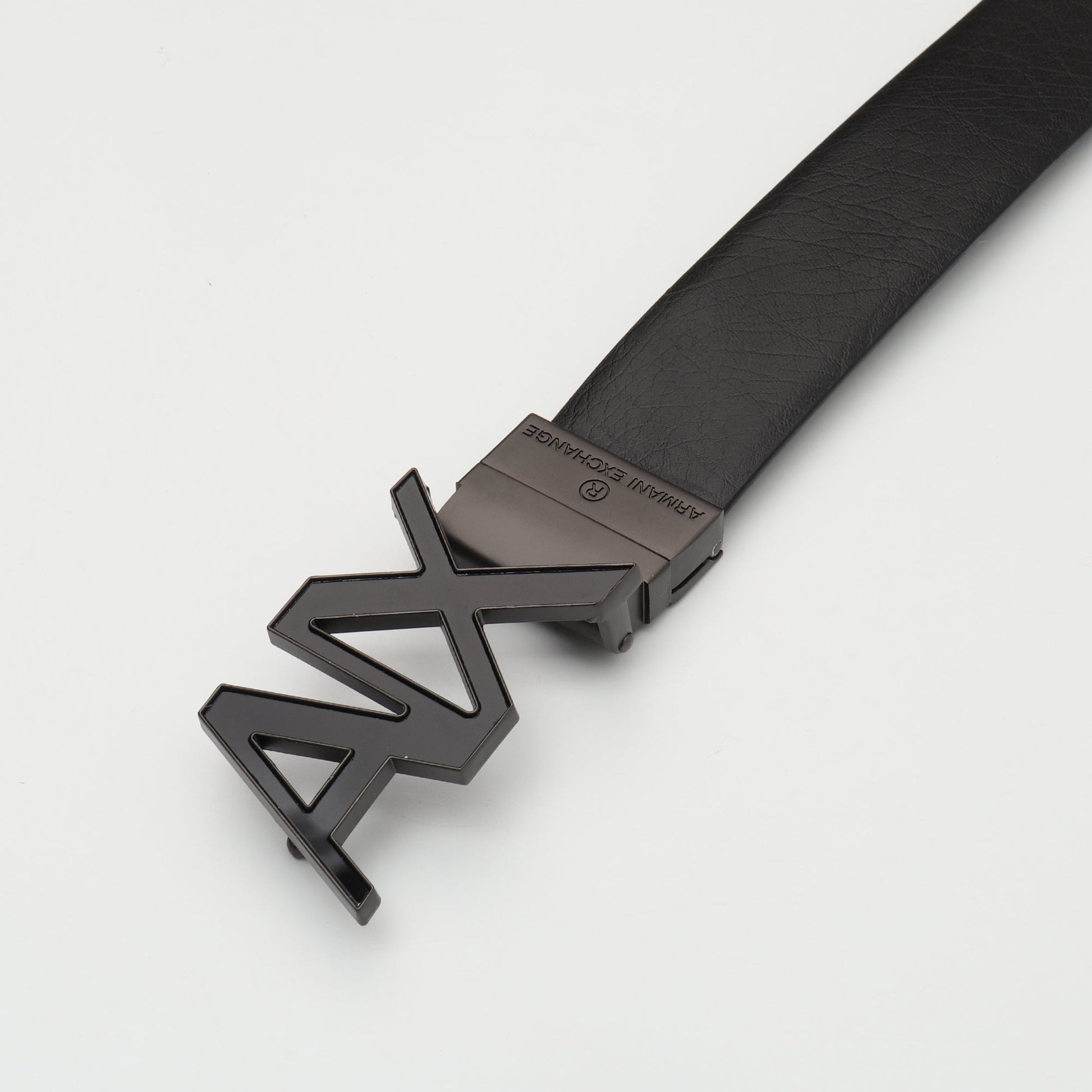 Sharp and contemporary, this Armani Exchange belt makes a bold impact with its full matte-black finish and iconic oversized A|X buckle. Clean and commanding, it’s designed for trendsetters who prefer understated confidence.