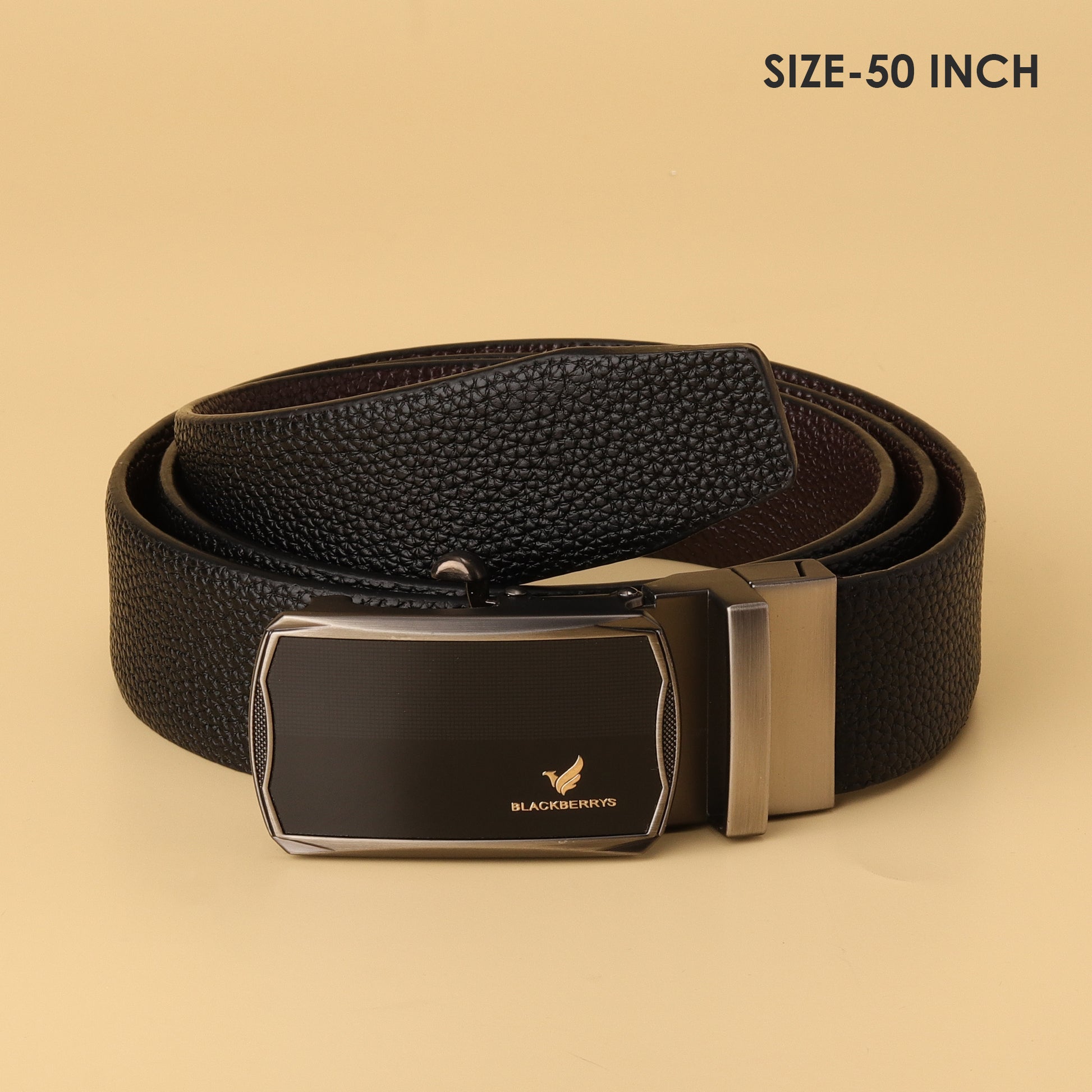 Step into sophistication with the Blackberrys Reversible Black Textured Leather Belt. Crafted from premium quality leather, it features a sleek automatic buckle with the iconic Blackberrys insignia. Its reversible design, switching seamlessly between black and brown, ensures versatility for both formal and casual wardrobes.