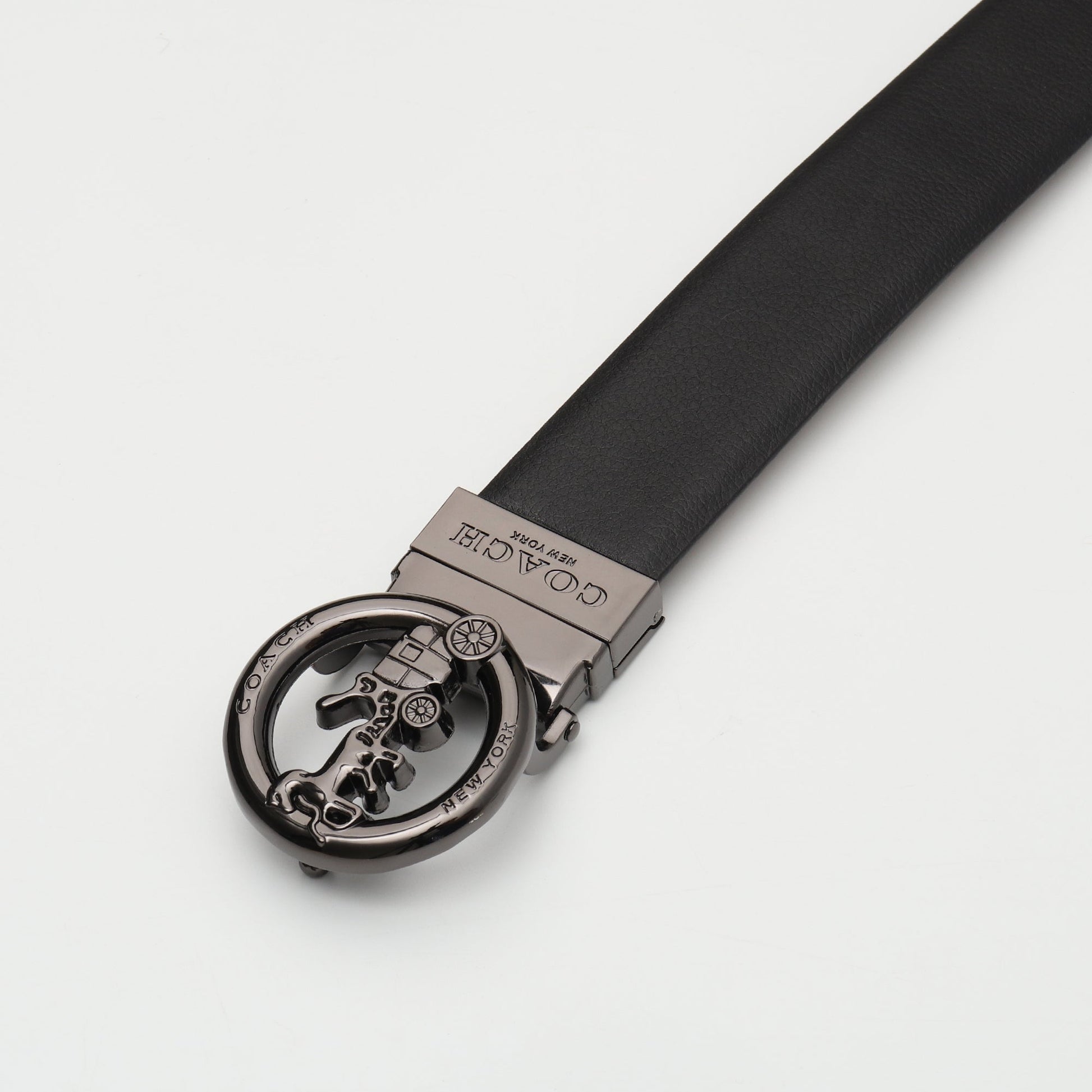 Featuring the iconic Coach carriage emblem in a circular matte black buckle, this belt is crafted from premium black leather with a reversible brown underside. A symbol of refined heritage with everyday utility.