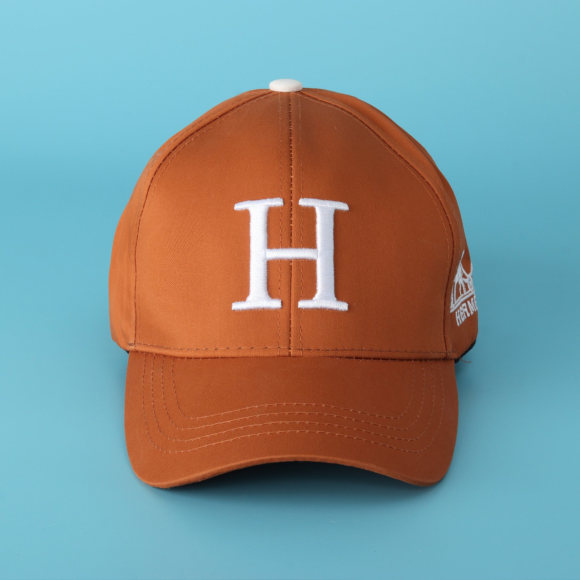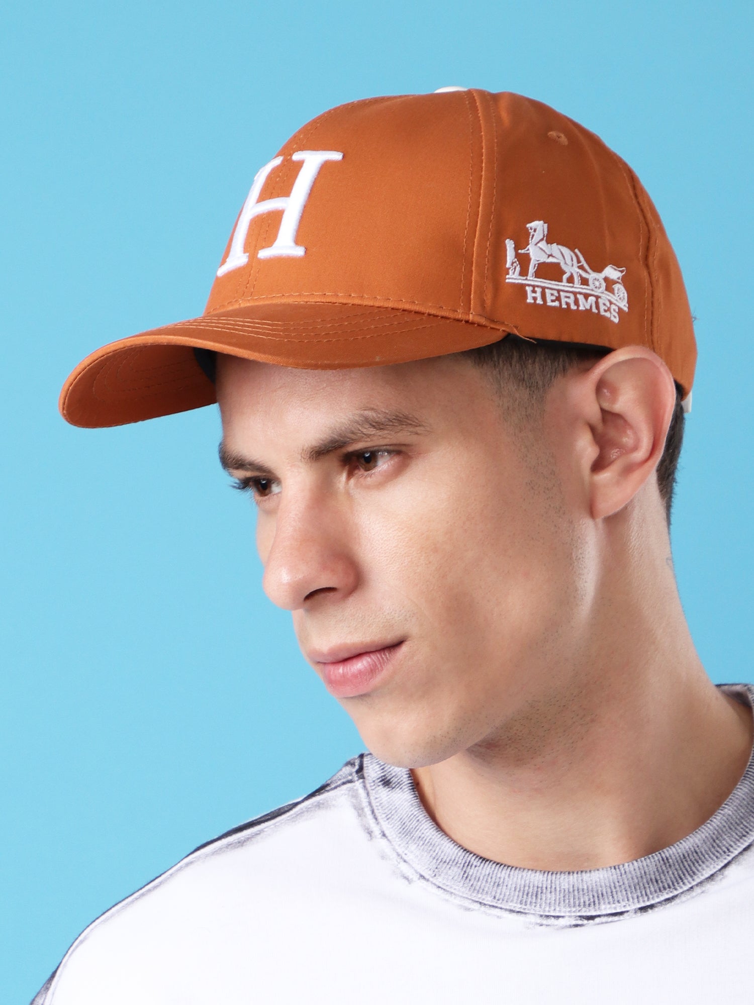 This baseball cap offers a blend of classic style and sophisticated branding. The cap is a rich burnt orange color, giving it a warm, eye-catching look. The front features a large, bold embroidered "H" in white, making a clean and elegant statement. On the side, a detailed white horse-and-carriage logo with "HERMES" is also embroidered, a subtle nod to luxury heritage. The cap's six-panel design and curved brim provide a traditional fit, while the adjustable strap ensures comfort. This versatile accessory is perfect for adding a pop of color and a touch of class to any casual outfit.