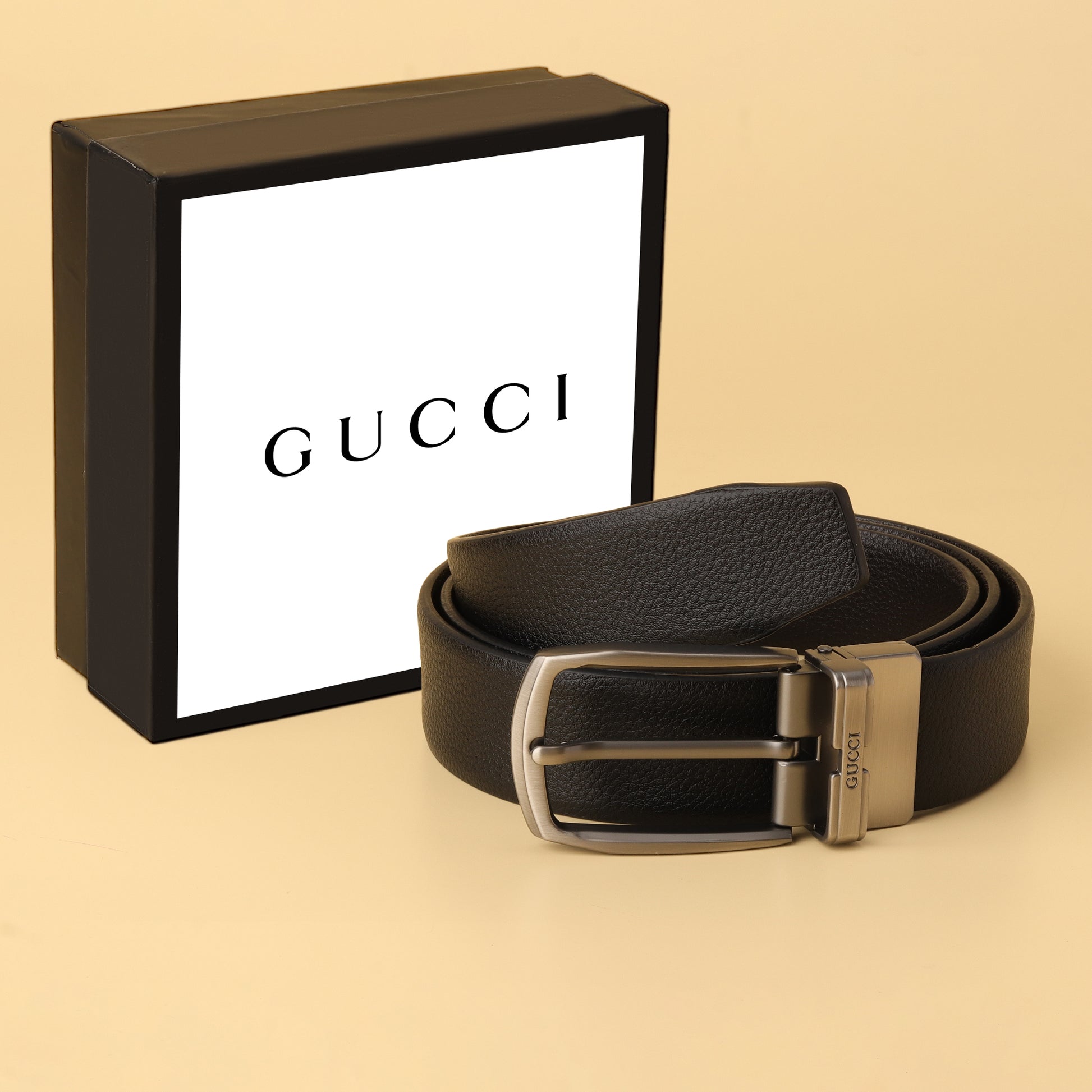 Crafted for the modern gentleman, the Gucci Classic Reversible Buckle Belt combines luxury with everyday functionality. Made from premium textured leather, this 47-inch belt features a brushed silver buckle with the Gucci logo engraved for a subtle yet iconic statement. Its reversible design in black and dark brown ensures effortless versatility, making it a timeless addition to your wardrobe.