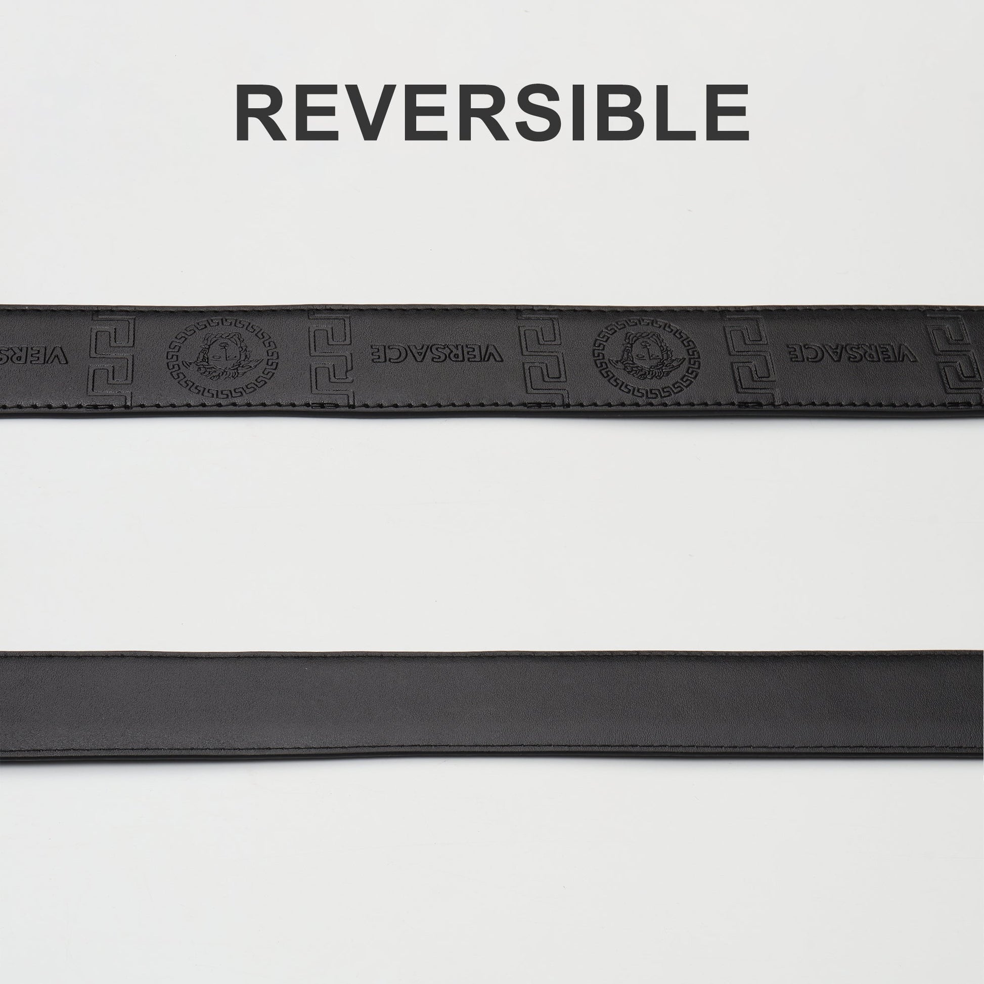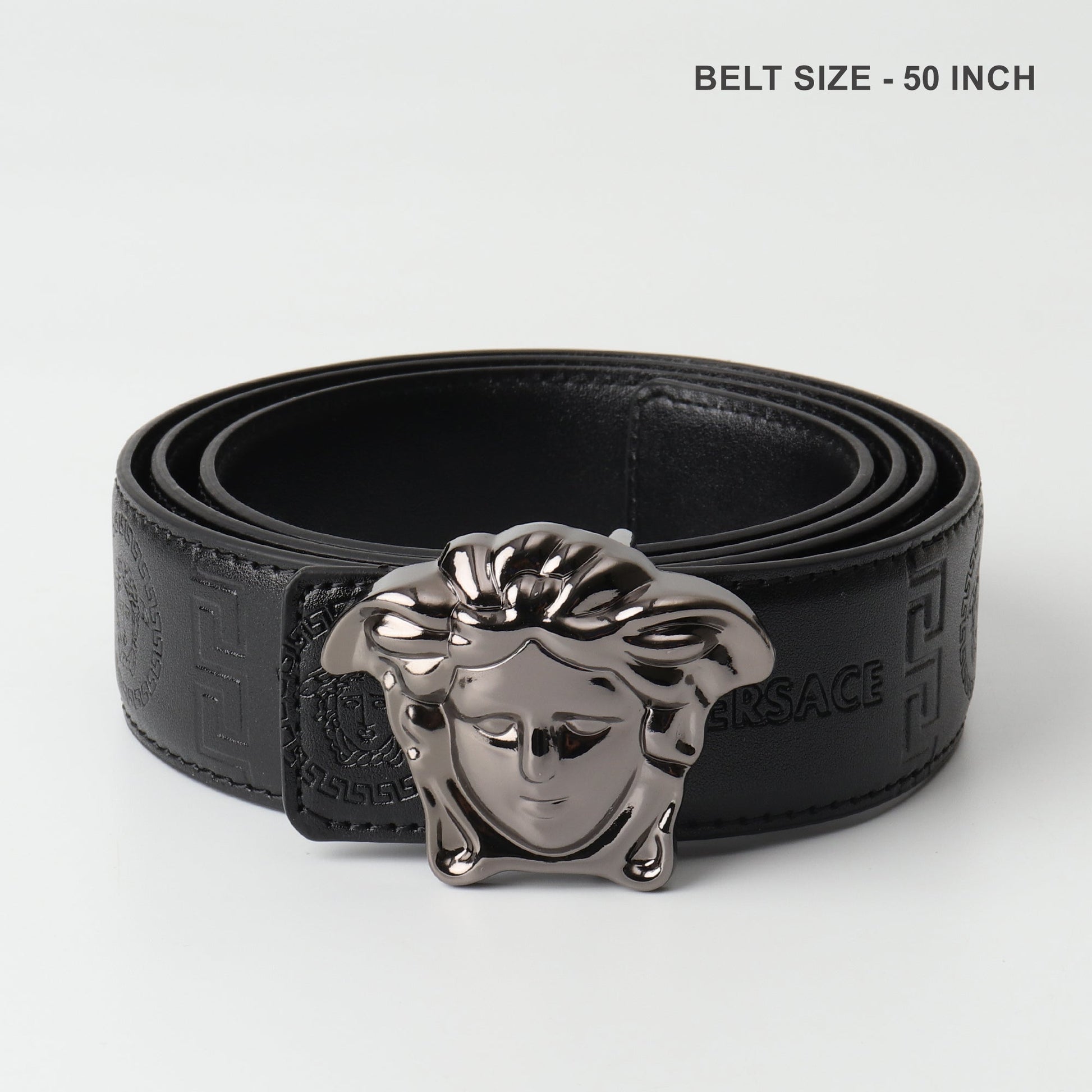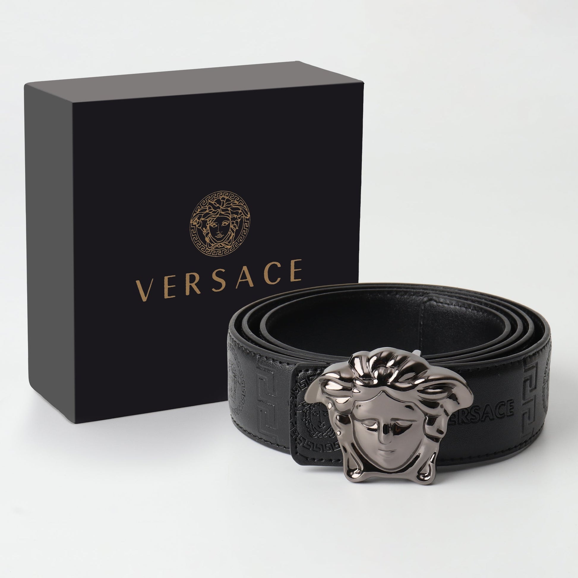 A bold expression of iconic luxury, this Versace belt features the legendary Medusa head buckle in gunmetal, paired with embossed Greek key and monogram patterns across jet-black leather. Powerful, dramatic, and unmistakably Versace.