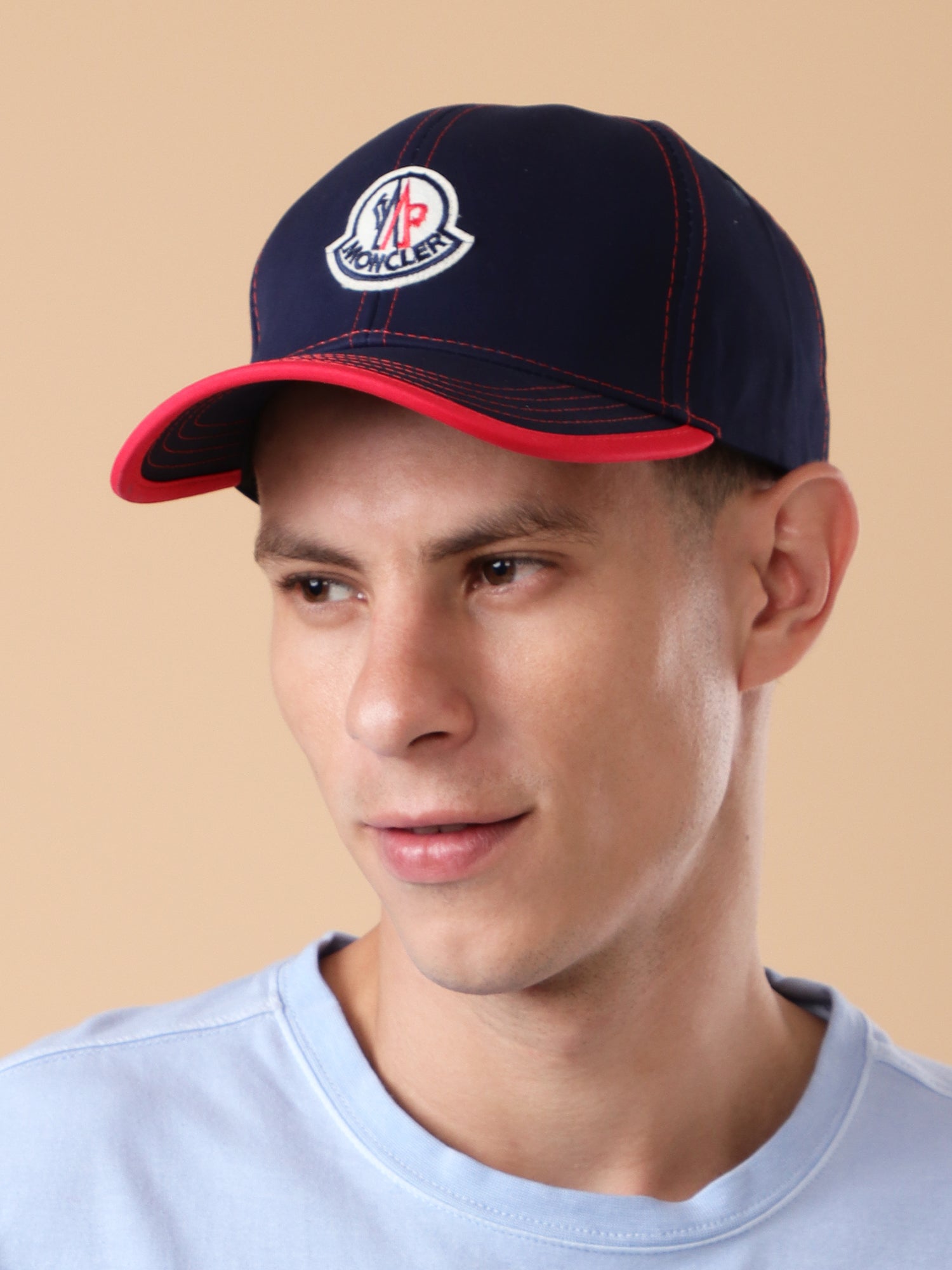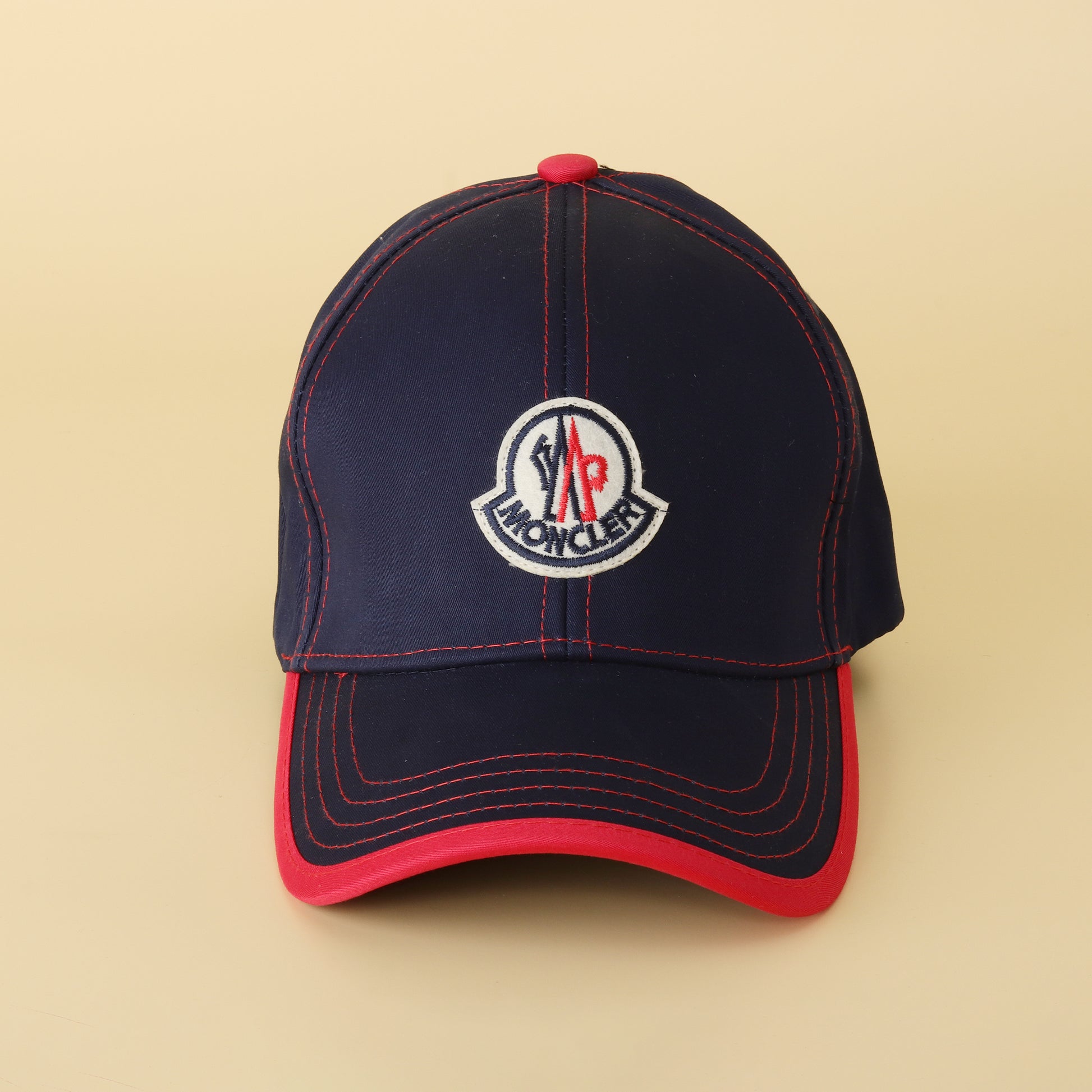 This Moncler baseball cap is a stylish blend of sport and luxury, featuring the brand's signature details. The cap comes in a deep navy blue, which is highlighted by vibrant red accents on the brim and stitching, creating a striking contrast. A prominent Moncler tricolor logo patch is stitched on the front, showcasing the brand's iconic emblem. With a classic six-panel design and a curved brim, this cap offers a comfortable and timeless fit. An adjustable strap at the back ensures it's the perfect accessory for both everyday wear and casual outings.