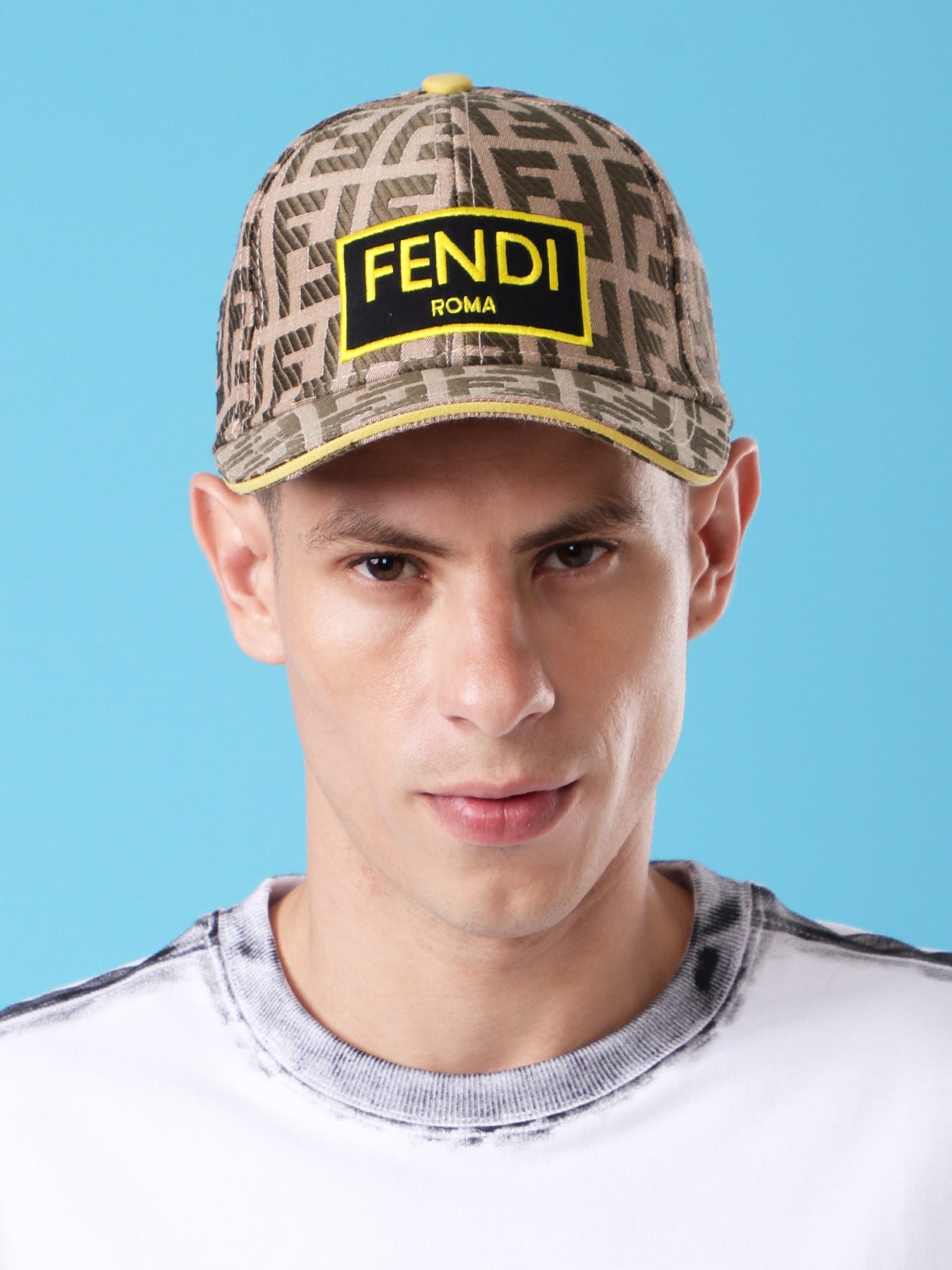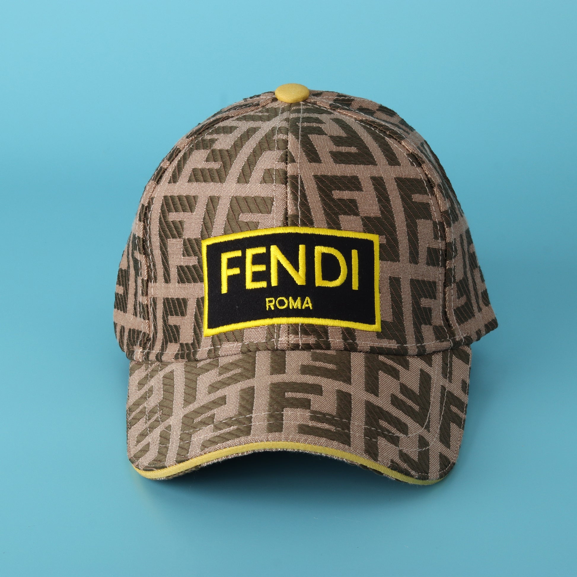 Bold embroidered black & yellow Fendi Roma patch on the crown